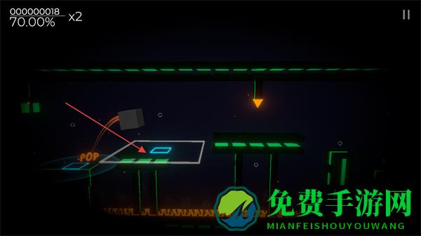 1、进入游戏,操控方块在平台上移动,屏幕左上角显示分数和倍数,如0000000007x1,70.00%可能是通关进度。