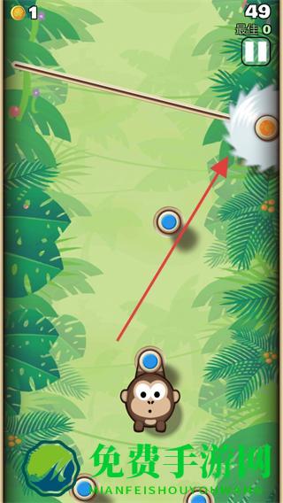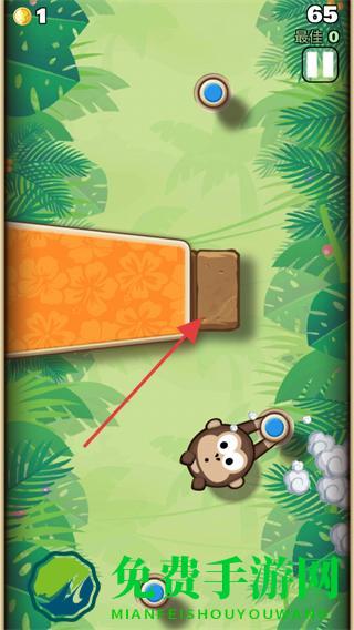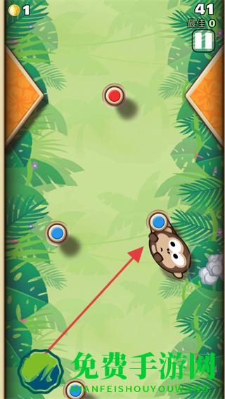1、进入游戏,操控小猴子移动,让小猴子触碰蓝色圆点,借助圆点反弹向上移动,避开红色圆点。