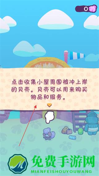 1、进入游戏,根据提示点击收集小屋周围被冲上岸的贝壳,屏幕右上方会显示贝壳数量。