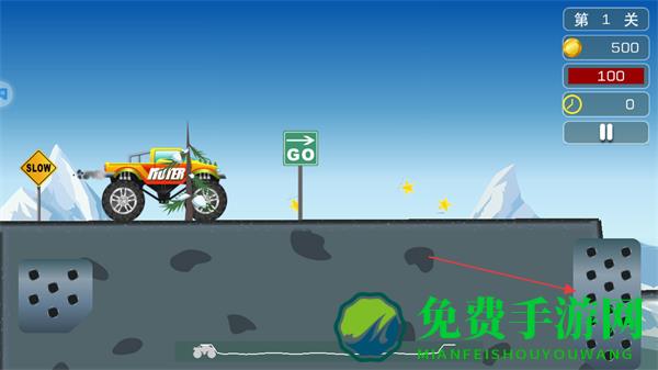 1、进入第1关,点击屏幕右侧的油门按钮控制大脚车前进。