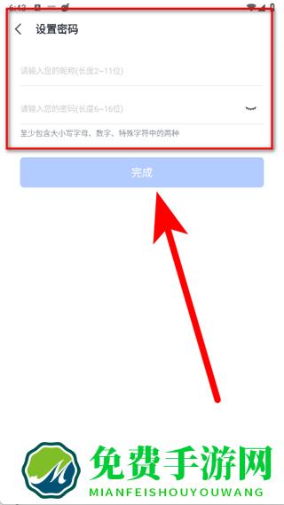 5、进入设置密码页面,按要求输入昵称和密码,点击完成,完成注册。
