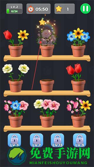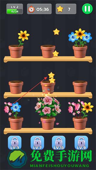 1、留意屏幕上方等级LV.2、倒计时05:50和星星数量,找到三朵相同花朵进行合成获取星星。