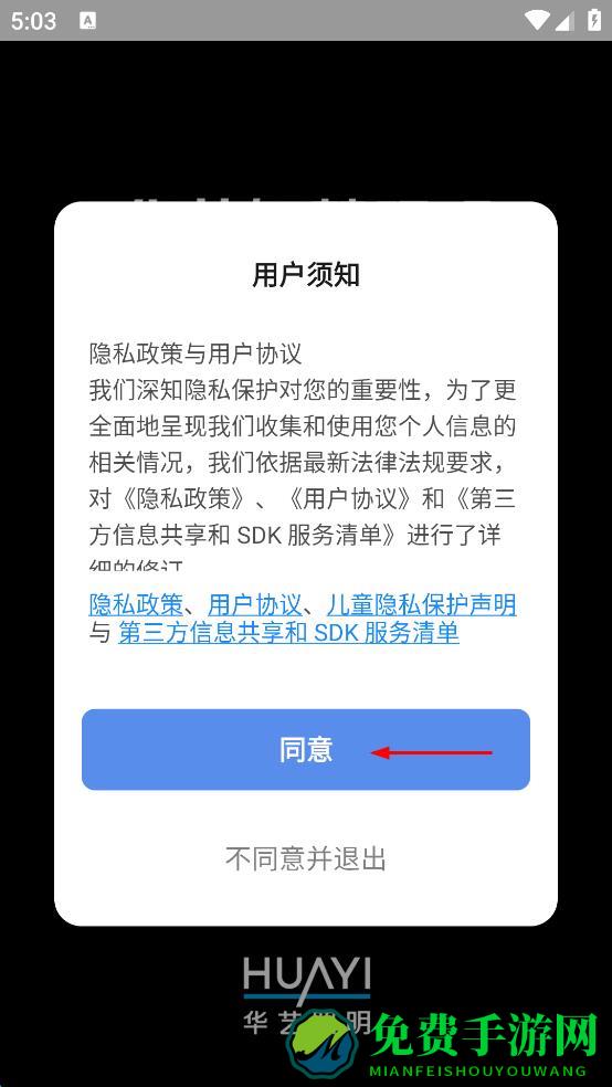 1、打开华艺照明,在用户须知提示框中,点击“同意”,进入华艺照明登录选择页面。