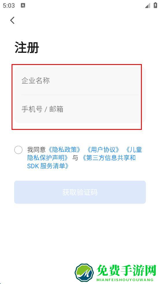 3、在注册页面,依次输入企业名称以及手机号或邮箱。