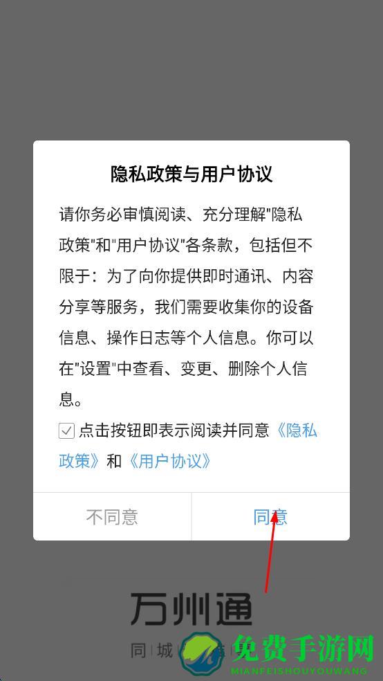1、打开万州通,在隐私政策与用户协议提示框中,点击“同意”,进入万州通主界面。
