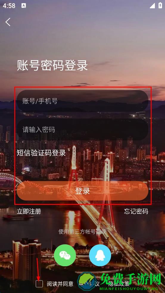 4、在帐号密码登录界面,勾选“阅读并同意用户协议、隐私政策”,输入账号/手机号和密码,点击“登录”即可。