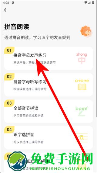 2、在拼音朗读页面,点击拼音字母发声练习。