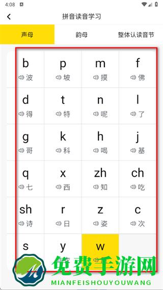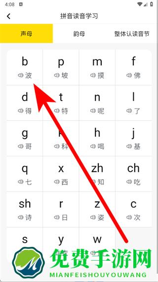 3、进入拼音读音学习的声母页面,点击声母进行读音练习。