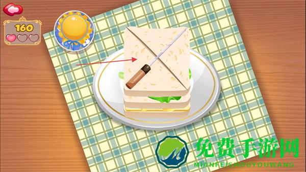 4、完成切割,做出摆盘好看的三明治,获取分数如260,上菜给顾客。