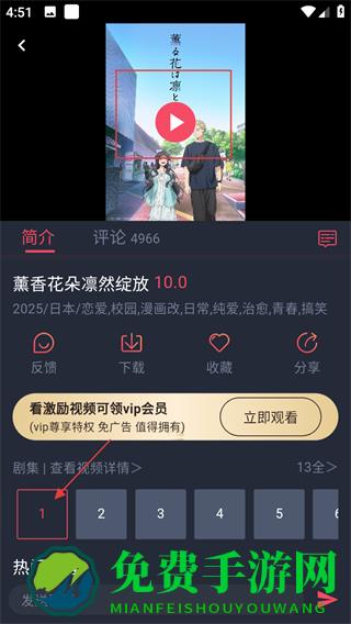 4、在日漫播放页面,点击播放按钮,选择1集,开始观看日漫内容。