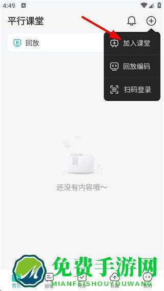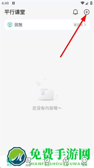 1、在平行课堂首页,点击右上角的+号,展开功能选项。