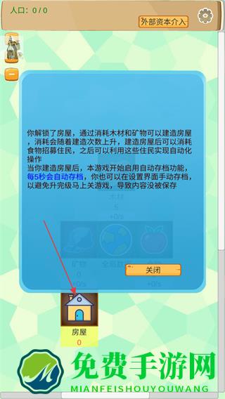 1、看到解锁房屋提示后,了解到可消耗木材和矿物建造房屋,点击关闭按钮关闭提示框。