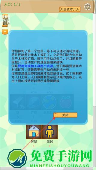 4、招募到第一个居民后,阅读培养居民成为伐木工或矿工等相关说明,点击关闭按钮,后续通过消耗资源培养居民实现自动化生产。