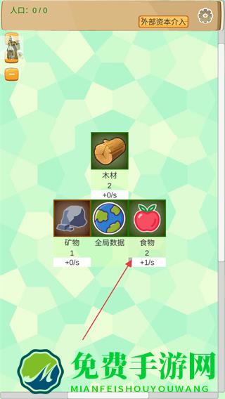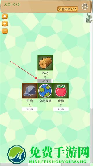 1、进入游戏界面,查看木材,矿物,食物等资源的初始数值及增长速度,如木材2+0/s。