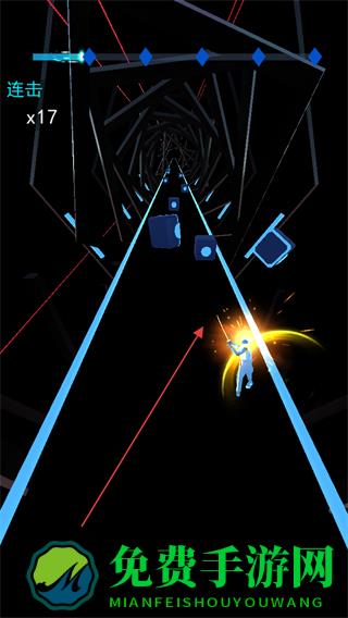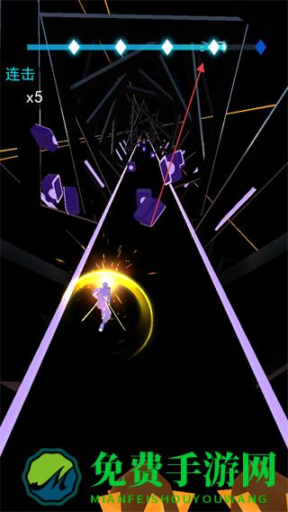 赛道中会随机出现加速、变向等特殊机制,配合节奏变化的方块,要求玩家在保持节拍感的同时快速调整操作,考验手眼协调能力。