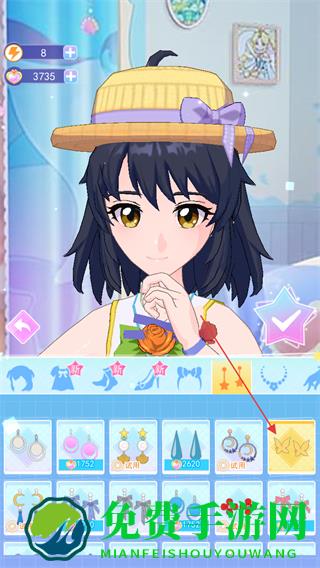 1、进入游戏换装界面,查看左侧的等级8和货币数量3735,点击下方服装分类中的衣服,给角色试穿。