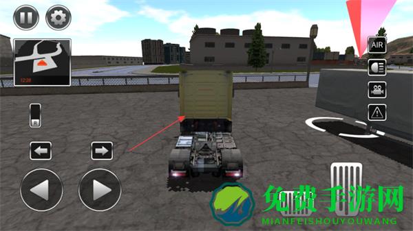 2、操控屏幕左侧方向按钮,将卡车行驶到货箱位置,连接货箱。