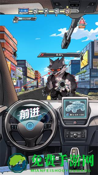 1、进入游戏,点击前进按钮,驾驶车辆在末日城市道路上行驶。
