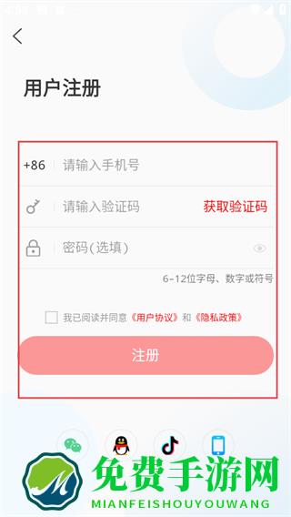 4、在用户注册页面,输入信息,勾选协议后,点击注册,完成账号注册。
