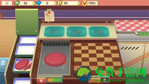 1、查看界面上方资源数值,点击食材栏取牛肉饼,放烤架上烹饪。