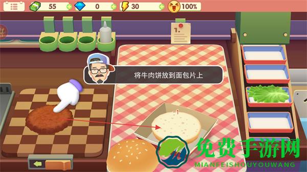 2、牛肉饼烤好后,按提示将其放到面包片上。
