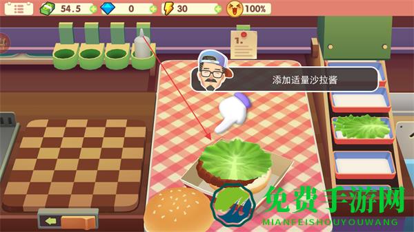 3、从食材栏选取生菜放在牛肉饼上,再添加适量沙拉酱。
