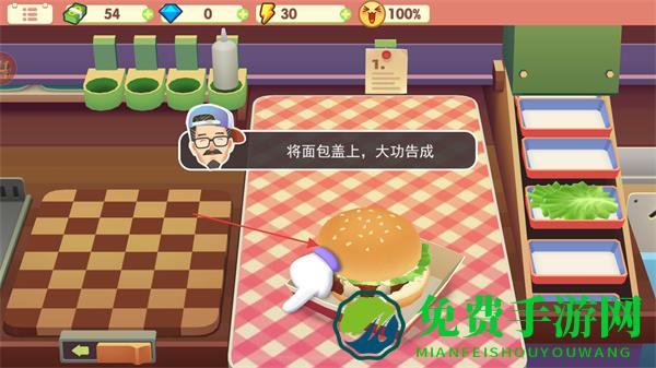 4、最后将另一片面包盖上,完成汉堡制作,满足顾客需求。