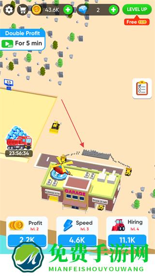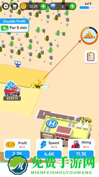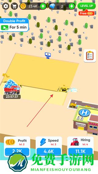 2、点击下方Hiring按钮,花费金币雇佣更多推土机,提升挖掘效率。