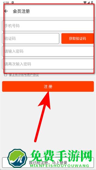 4、填写手机号码、验证码、密码,再次输入密码后,点击注册。