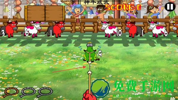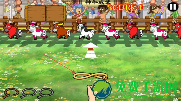 1、进入游戏,看到牛群跑动,屏幕上方显示SCORE分数为0,手持绳索准备套牛。