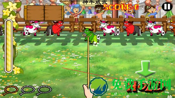 3、在合适时机松开操作,尝试套住前方的牛或特殊动物来得分。