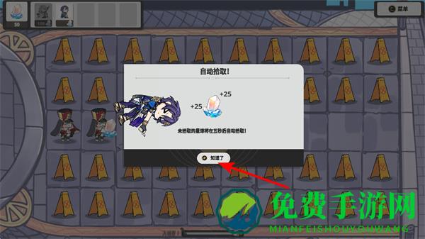 3、领取战斗资源,在自动拾取提示界面,领取战斗中获得的资源,积累资源用于角色升级、技能解锁等,提升战力。