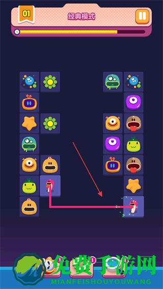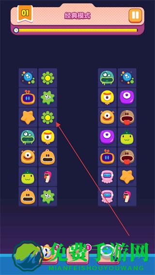 1、进入游戏,选择经典模式,查看关卡进度如01,在界面中找到两个相同的图案。