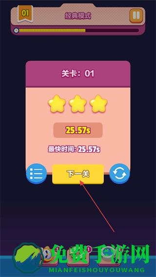 4、在规定时间内消除所有图案后,根据用时获得星级评价,点击下一关按钮进入下一关挑战。