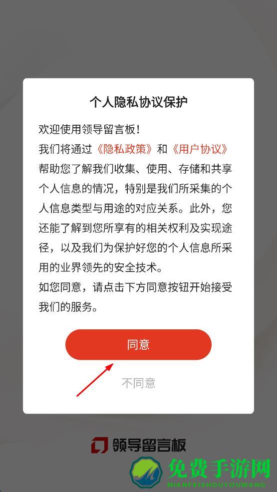 1、打开领导留言板App,出现个人隐私协议保护弹窗,阅读后点击同意按钮。