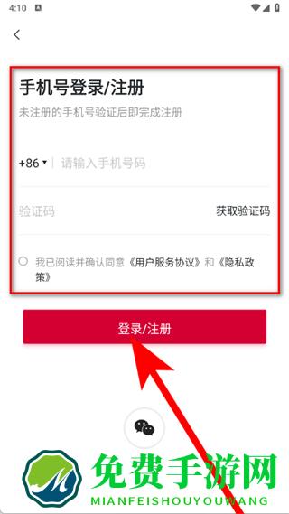 4、输入手机号码,点击获取验证码,输入收到的验证码,勾选后,点击登录注册按钮,完成注册操作。