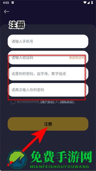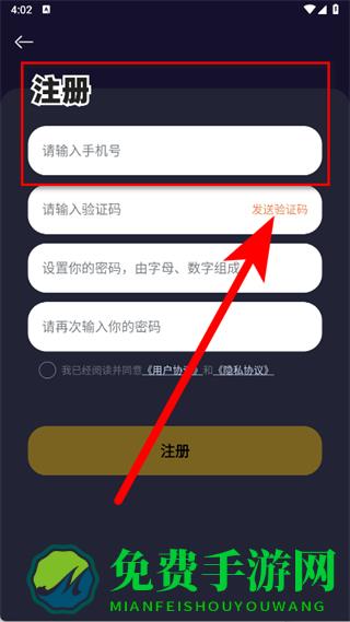 3、在注册页面,输入手机号,点击发送验证码,然后输入收到的验证码。