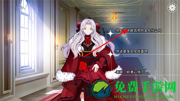 2、选择对话选项,在与红衣角色的对话中,选择你知道平民饥荒时会吃什么吗选项,开启该对话分支,影响剧情走向和角色互动。