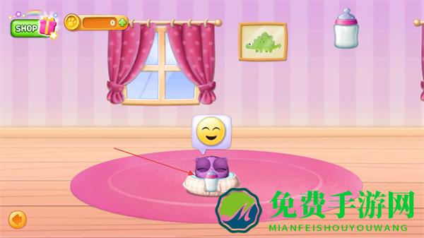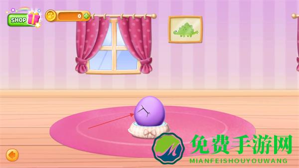 1、进入游戏,看到紫色宠物蛋在粉色垫子上,等待它孵化。