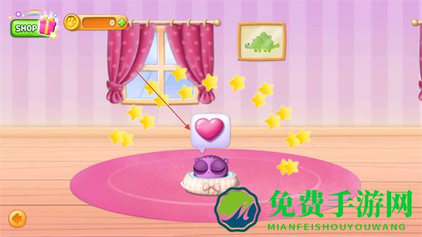 采用明亮鲜艳的卡通动画风格,宠物屋场景布置温馨可爱,搭配柔和的色彩与简洁的装饰,营造轻松愉悦的养成氛围。