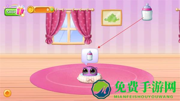 3、当宠物头上出现奶瓶图标时,点击右侧奶瓶道具,给宠物喂食。