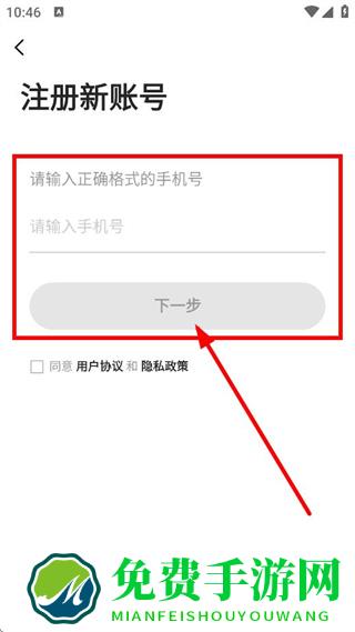 4、在注册新账号页面,输入正确格式的手机号后,点击下一步,继续注册流程。