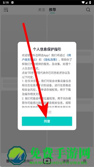 1、打开抖音精选,点击个人信息保护指引弹窗中的同意。