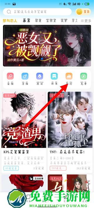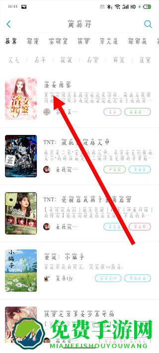 2、进入排行页面,能看到各类榜单及对应的小说作品,挑选一部感兴趣的小说并点击。