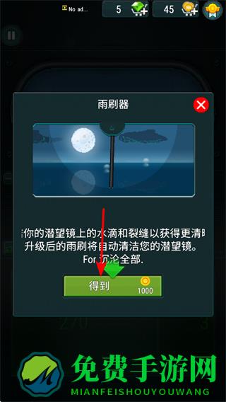 3、在雨刷器升级界面,点击得到按钮,消耗1000金币可升级雨刷器,升级后能自动清洁潜望镜。