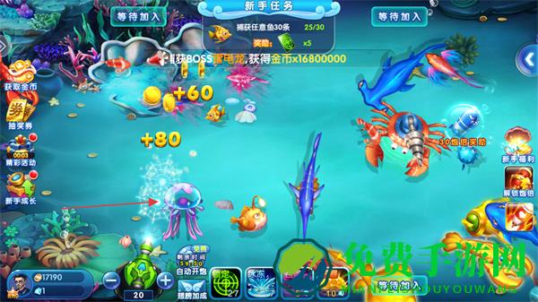 3、发现如章鱼等特殊鱼类时,瞄准发射渔网捕捉,获取更多金币奖励。