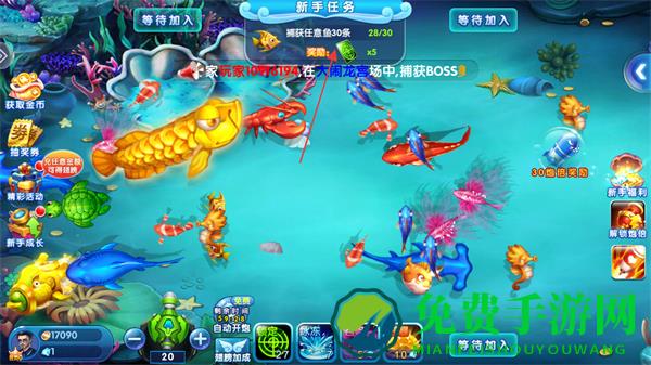 2、持续发射渔网捕捉游动的各类鱼,推进新手任务进度,留意捕获鱼后获得的金币。