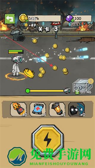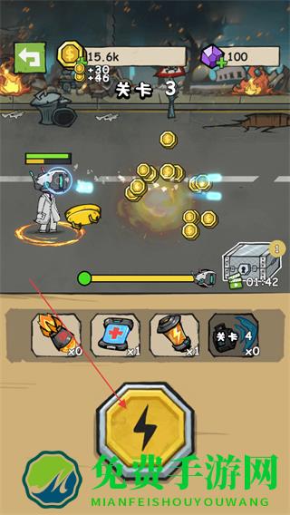 1、进入关卡3,点击下方闪电按钮释放技能,攻击敌人并收集金币。