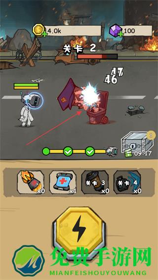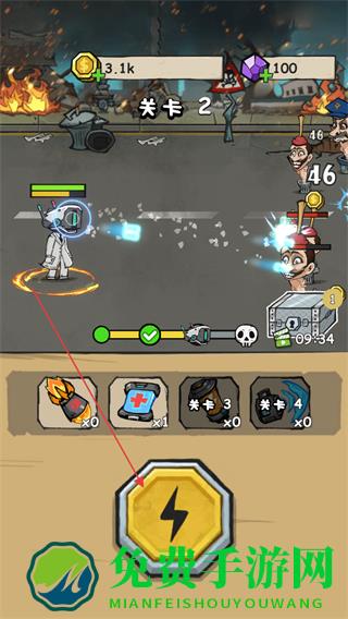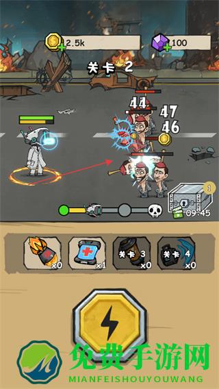 2、点击下方闪电按钮释放技能,快速打击敌人,推进关卡进度。