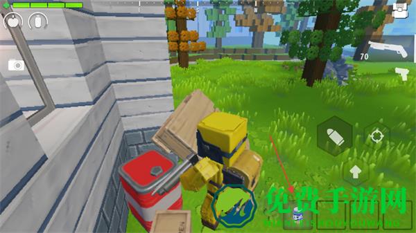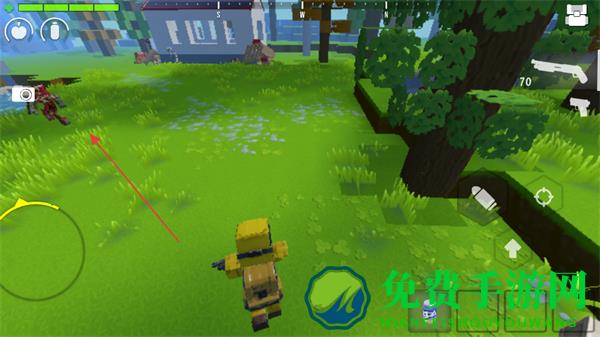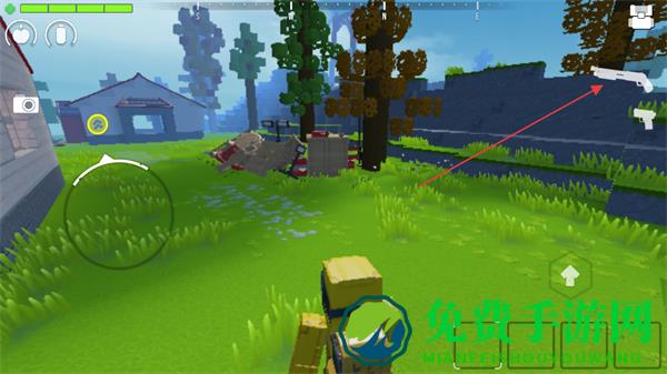 1、在方块世界中移动,切换武器如手枪,探索房屋、树林等区域,寻找资源和敌人。